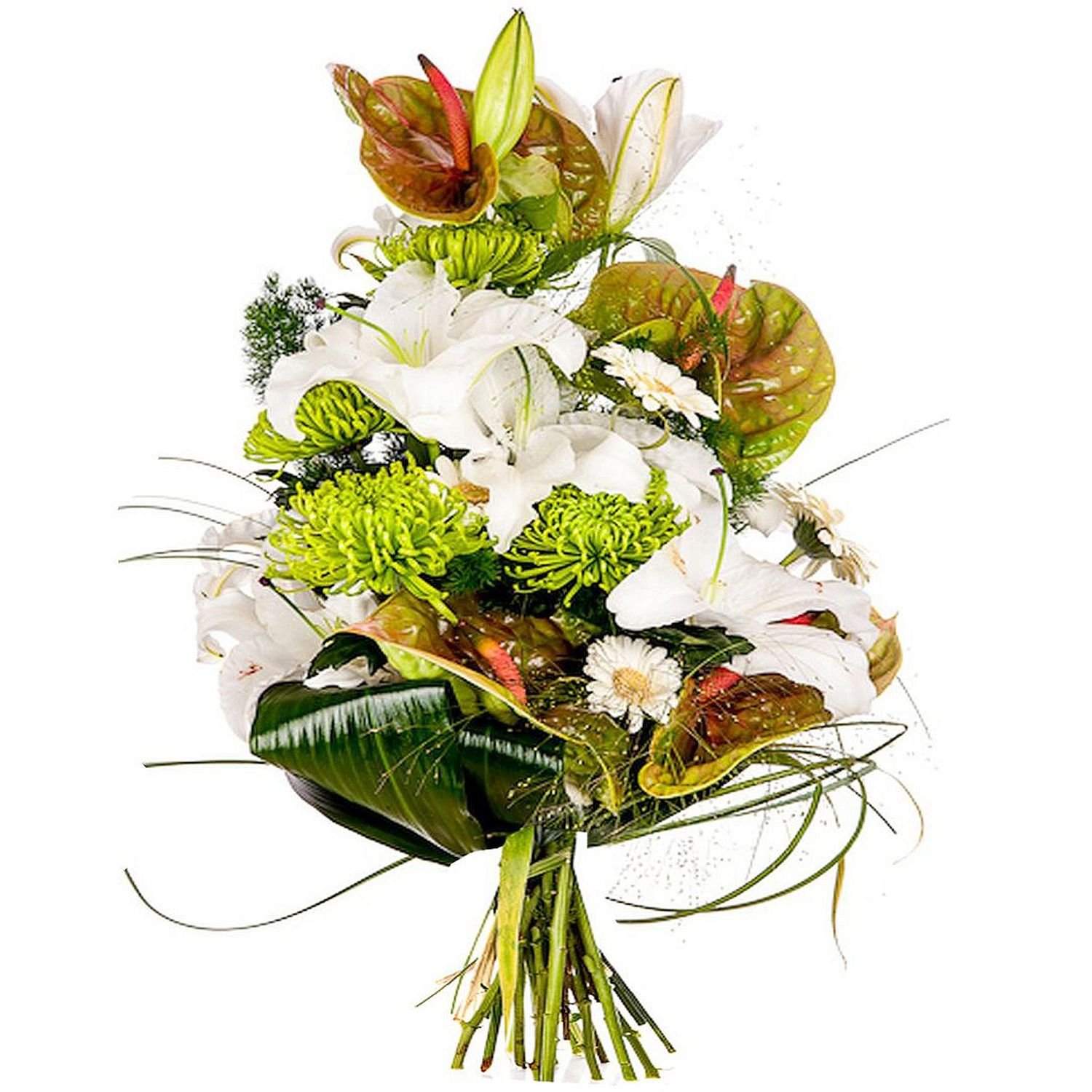 Tato elegantní kytice okouzlí svým nevšedním spojením exotických anthurii, něžných germín, bílých lilí a výrazných chryzantém, které jsou krásně doplněny dekorativní zelení. Výsledný celek působí svěže, originálně a velmi harmonicky. Vybrané odstíny bílé, zelené a jemně načervenalé tóny vytvářejí slavnostní atmosféru, která rozzáří každou příležitost – ať už hledáte dárek k narozeninám, poděkování, či jen chcete potěšit své blízké. Garantujeme doručení v den objednávky během pracovních dnů a potvrzení o doručení obdržíte na e-mail. Navíc si můžete zvolit přesný čas doručení, abychom předali květiny v ten správný okamžik. Naše profesionální floristky kladou maximální důraz na formu předání a detail každé vazby.