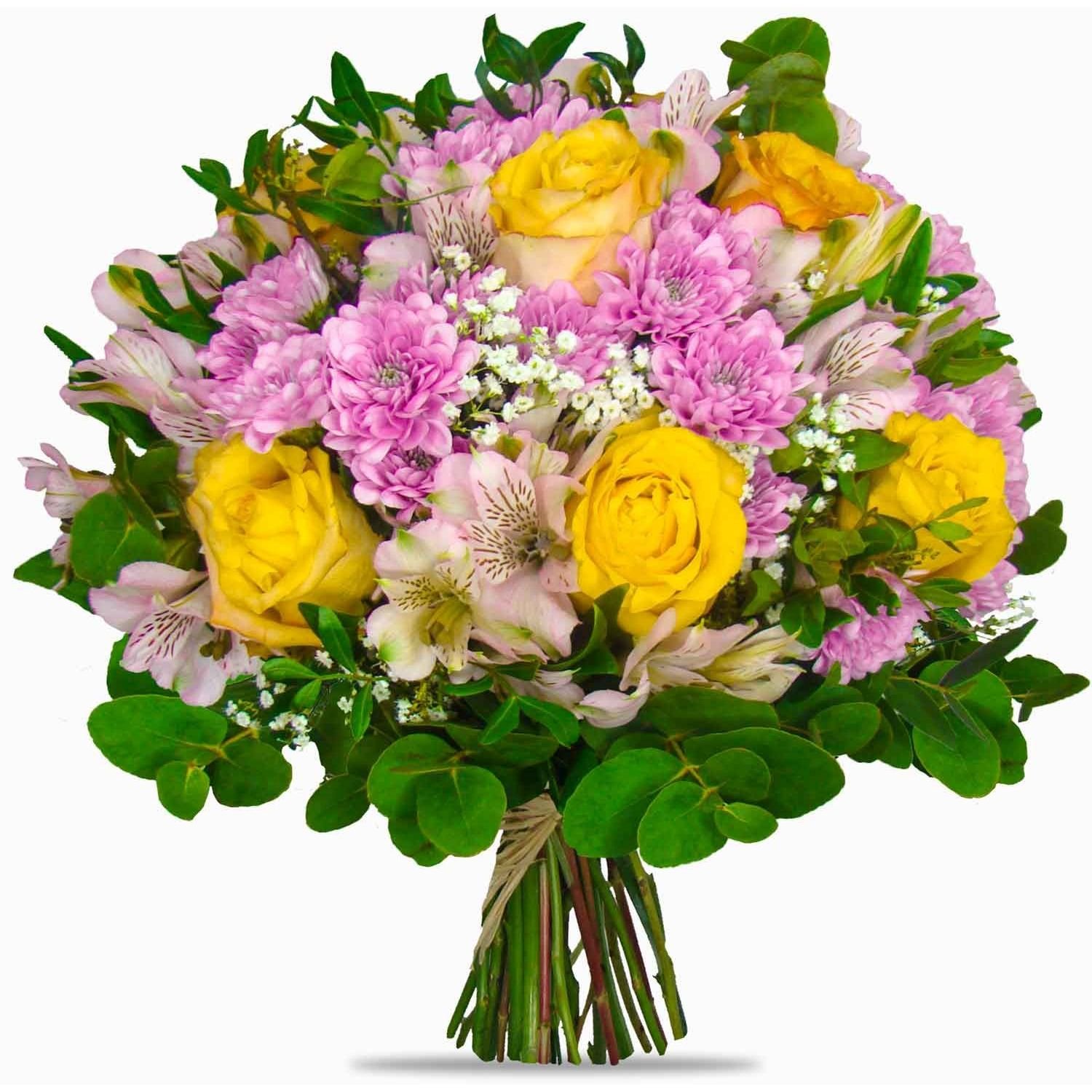 Kombinace žlutých růží, jemných alstromerií a zářivých chrysanthém spolu vytváří harmonickou a svěží květinovou kompozici vhodnou ke každé příležitosti, kde chceme potěšit a navodit příjemnou atmosféru. Svěží zelené doplňky dodávají kytici lehkost a přírodní dojem, zatímco decentní gypsophila celé aranžmá krásně zjemňuje. Tato kytice vynikne jako dárek k narozeninám, poděkování i při významných okamžicích, kdy toužíme vykouzlit úsměv na tváři obdarovaného. Doručujeme v den objednávky během pracovních dnů, nabízíme také možnost zvolit přesný čas doručení. Naši zkušení floristé pečlivě dbají na profesionální vzhled kytice a ručíme za jistotu doručení – vše Vám potvrdíme e-mailem.