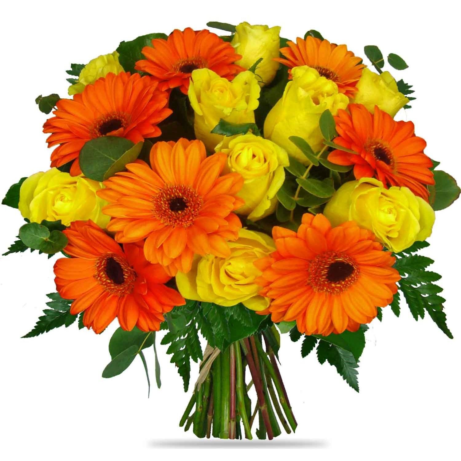 Tato energická kytice přináší radostné spojení sytě oranžových a zářivě žlutých květin, které spolu vytvářejí živou a optimistickou atmosféru. Krásné čerstvé růže a gerbery jsou doplněné svěží zelení a jemnými akcenty, díky nimž působí celek velmi harmonicky a přirozeně. Tento poutavý svazek je ideální pro narozeniny, poděkování nebo jako nádherné překvapení pro někoho blízkého, kdy chcete vykouzlit úsměv na tváři. Kytici vážeme vždy s maximální péčí z čerstvých květin. Objednávku doručujeme v den objednání během pracovních dnů a můžete si zvolit i přesný čas doručení. Samozřejmostí je jistota doručení i potvrzení e-mailem.