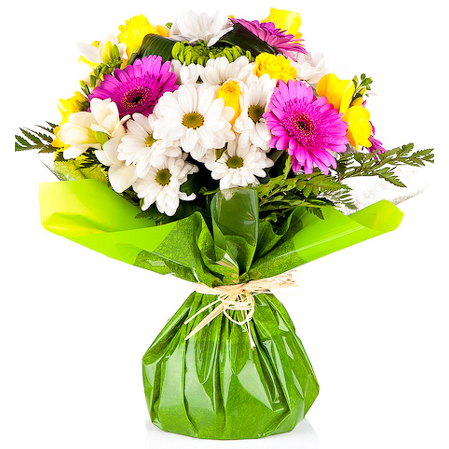 Barevná kytice působí radostným a svěžím dojmem, kde se v dokonalé harmonii prolínají zářivé růže, jemné frézie a pestré chryzantémy i germínky. Přirozeně ladí do veselých i slavnostních prostor a okouzlí jako dárek k narozeninám, poděkování nebo jen pro radost blízkým. Jemná zelená aranž má pozitivní energii a celé vazbě dodává přírodní a živý vzhled. Doručujeme v den objednávky během pracovních dnů, můžete si navíc zvolit i přesný čas doručení. Naše profesionálně uvázané květiny ručí za to, že každá kytice dorazí v perfektním stavu, a potvrzení o doručení obdržíte e-mailem.
