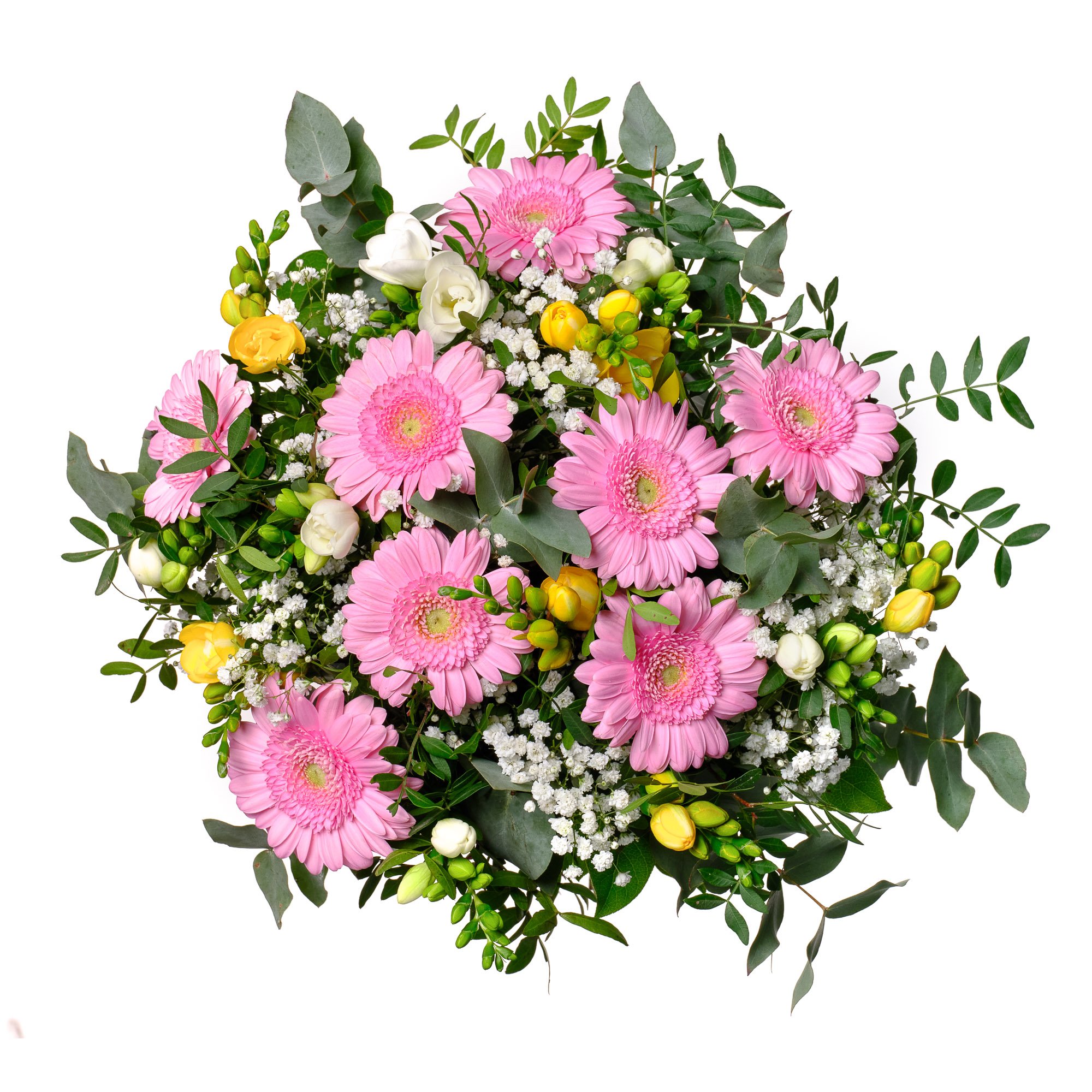 | Exkluzivní | 9 ks růžová mini gerbera, 6 ks bílá frézie, 6 ks žlutá frézie, 4 ks gypsophila a dekorativní sezónní zeleň (pistacie, eukalyptus, salal) |