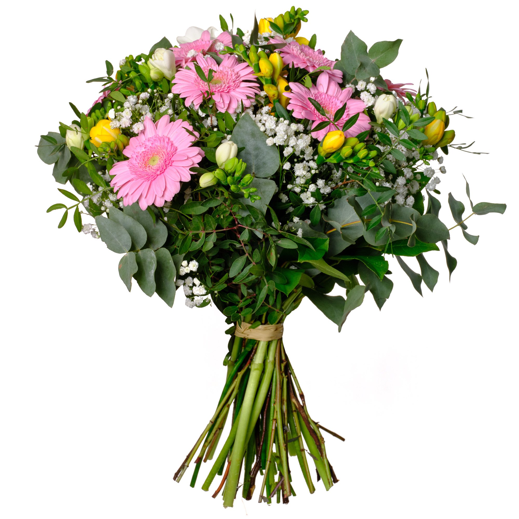 Naše kytice vyniká jemností růžových mini gerber v harmonii s bílými a žlutými fréziemi, které září svěžestí a vnášejí do aranžmá pocit lehkosti. Gypsophila vše nádherně odlehčuje a doplňuje bohatá zeleň, která kytici propůjčuje svěží a upravený vzhled. Celkově působí velmi radostně a optimisticky – hodí se jako vřelé poděkování, k narozeninám, nebo když chcete někomu jen tak udělat radost. Klademe důraz na formu předání – každá kytice je pečlivě svázána našimi zkušenými floristy. Rádi doručíme v den objednávky během pracovních dnů, potvrzení o doručení dostanete e-mailem a můžete si zvolit i přesný čas doručení.