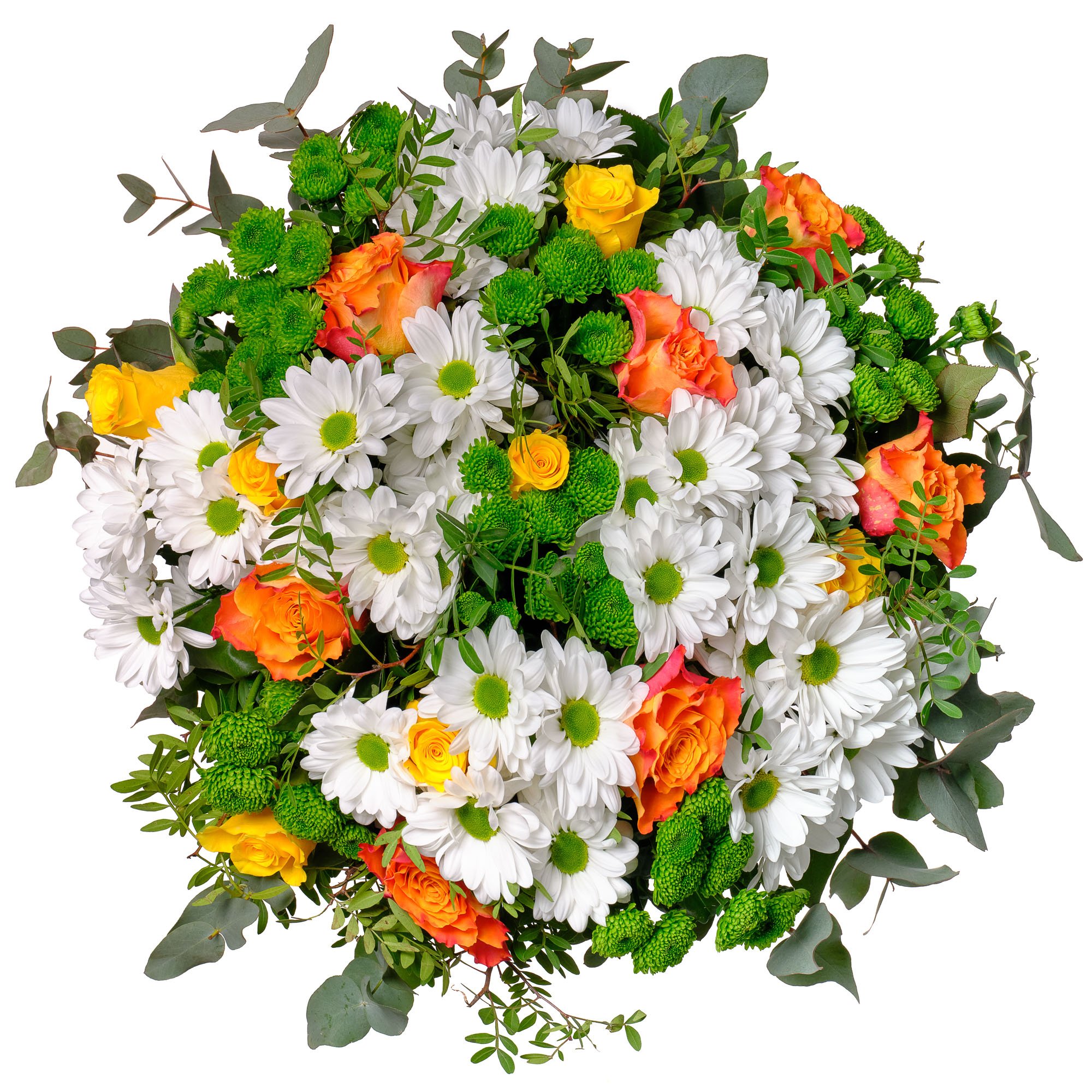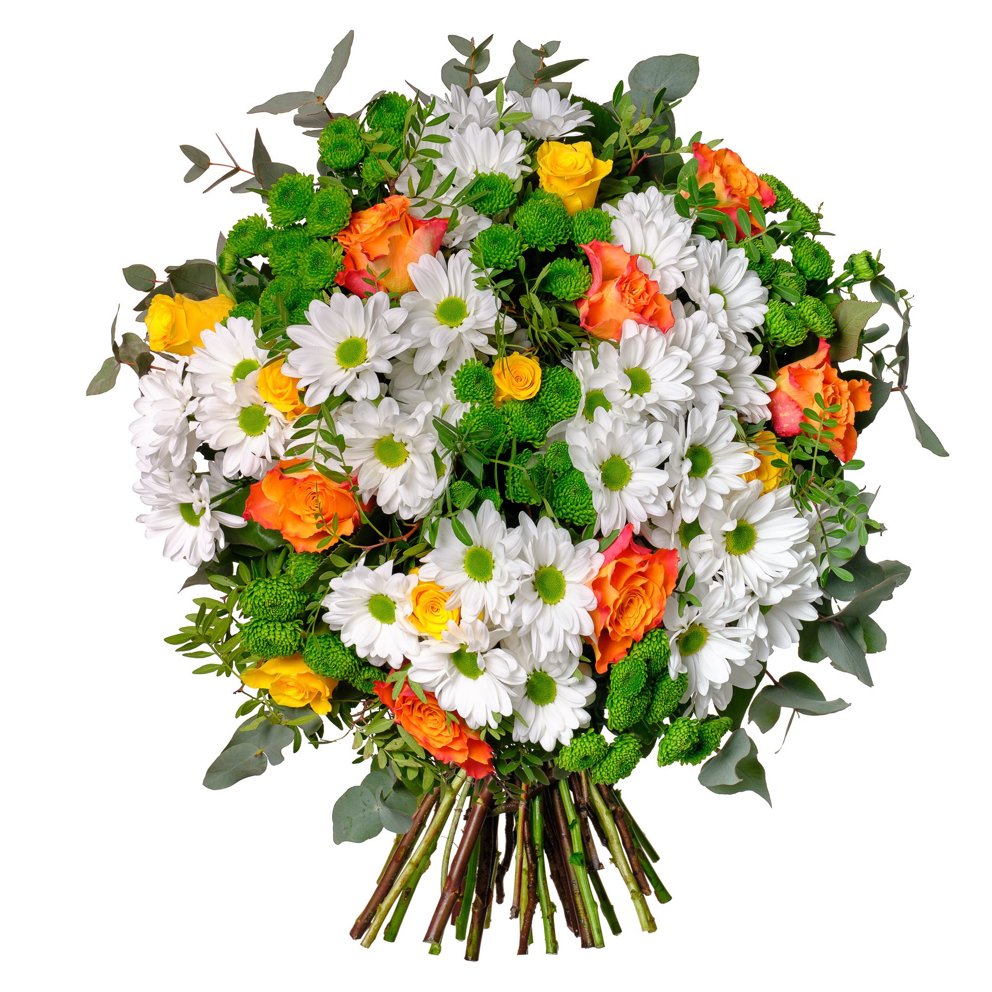 Naše kytice spojuje svěží kombinaci zářivých růží, jemných chryzantém a svých oblíbených zelených santinů, kterou doplňují elegantní listy eukalyptu. Vzájemné propojení sytě oranžových, čistě bílých a zelených odstínů působí optimisticky, svěže i pozitivně. Tento osobitý a pečlivě vyvážený celek se hodí pro nejrůznější příležitosti – potěší k narozeninám, podpoří při gratulaci nebo rozzáří všední den. Doručujeme v den objednávky během pracovních dnů a na přání lze zvolit přesný čas doručení. Samozřejmostí je potvrzení o doručení e-mailem, které Vám poskytne jistotu. Každá kytice je pro Vás připravena zkušenými floristy s maximální péčí.