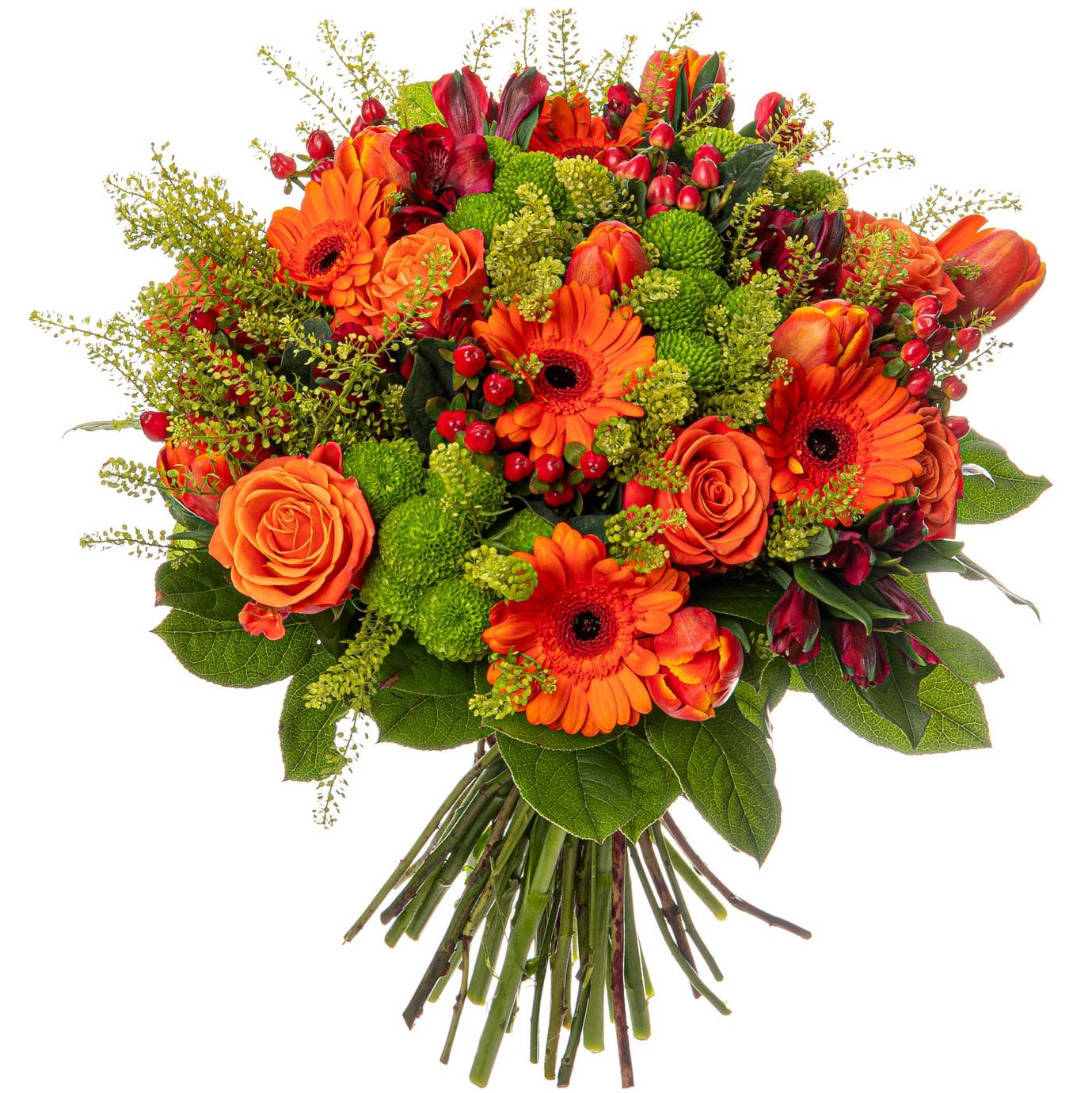 | Standardní | 3 ks gerbera mini oranžová, 3 ks santini, 3 ks alstromerie červená, 3 ks růže oranžová, 3 ks hypericum, 3 ks tulipán oranžový a dekorativní zeleň (pistacie, salal) |
