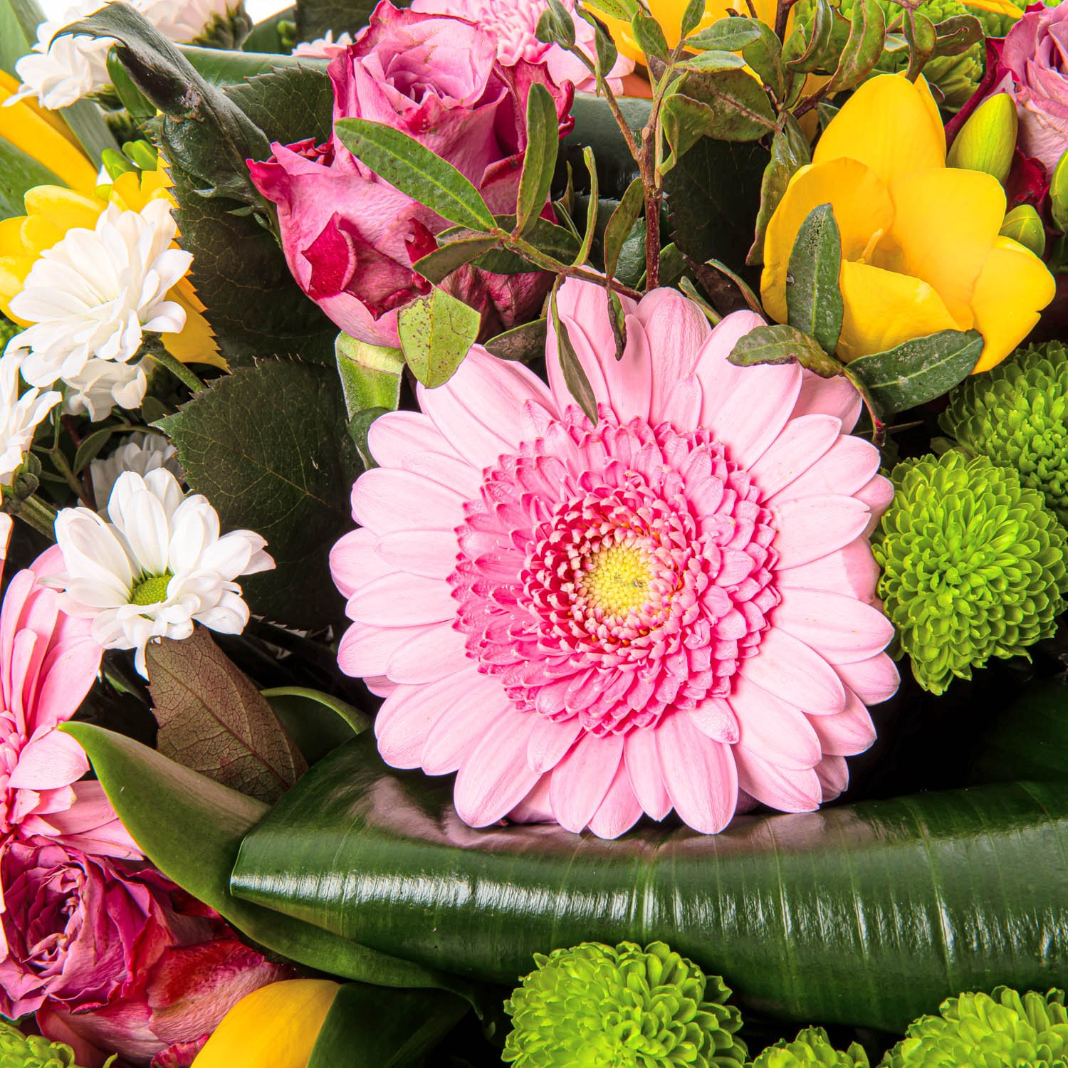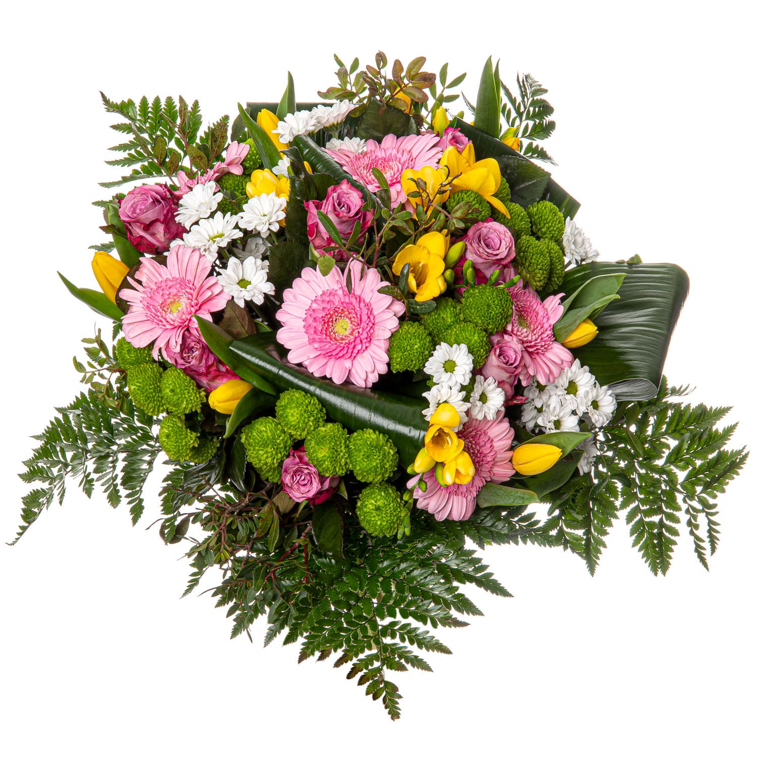 Tato kytice na první pohled zaujme osvěžující kombinací jemně růžových gerber, fialových a růžových růží, kontrastních žlutých tulipánů a svěžích santini v bílé i zelené barvě. Celý dojem podtrhuje lehká dekorativní zeleň, která dodává kytici přírodní šarm a harmonii. Dohromady květiny vytvářejí radostnou a optimistickou atmosféru, kterou oceníte při narozeninách, poděkování i běžných příležitostech, kdy chcete někoho potěšit. Kytici ručně vážou naši zkušení floristé, dbáme na každý detail a maximální svěžest květin. Doručujeme ještě v den objednávky během pracovních dnů a nabízíme možnost volby přesného času doručení. Spolehněte se na jistotu doručení a potvrzení e-mailem.