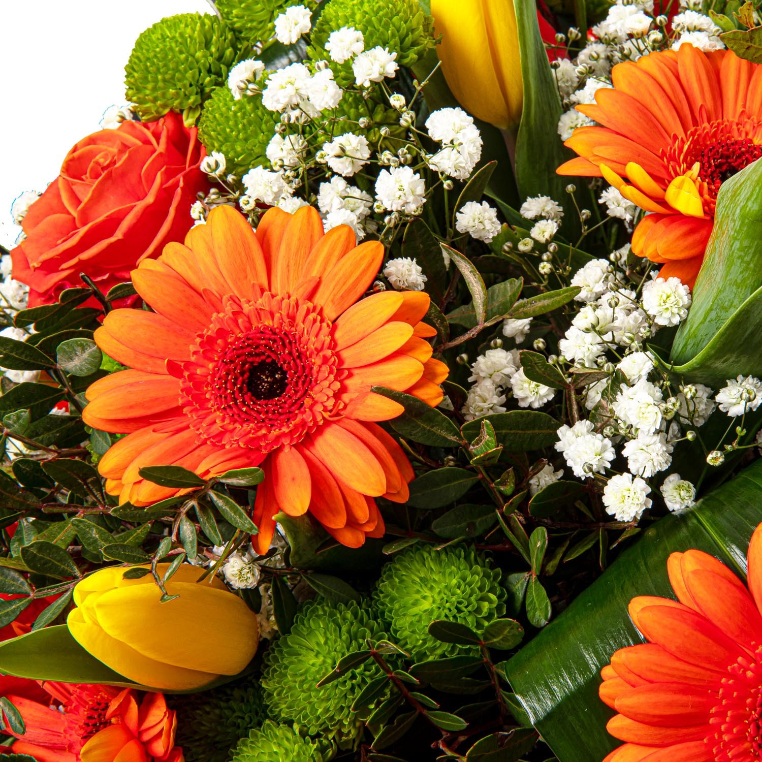 | Standardní | 3 ks růže, 3 ks gerbera mini, 3 ks santini, 5 ks tulipán, 3 ks gypsophila a dekorativní zeleň (aspidistra, pistacie, salal, rumora) |
