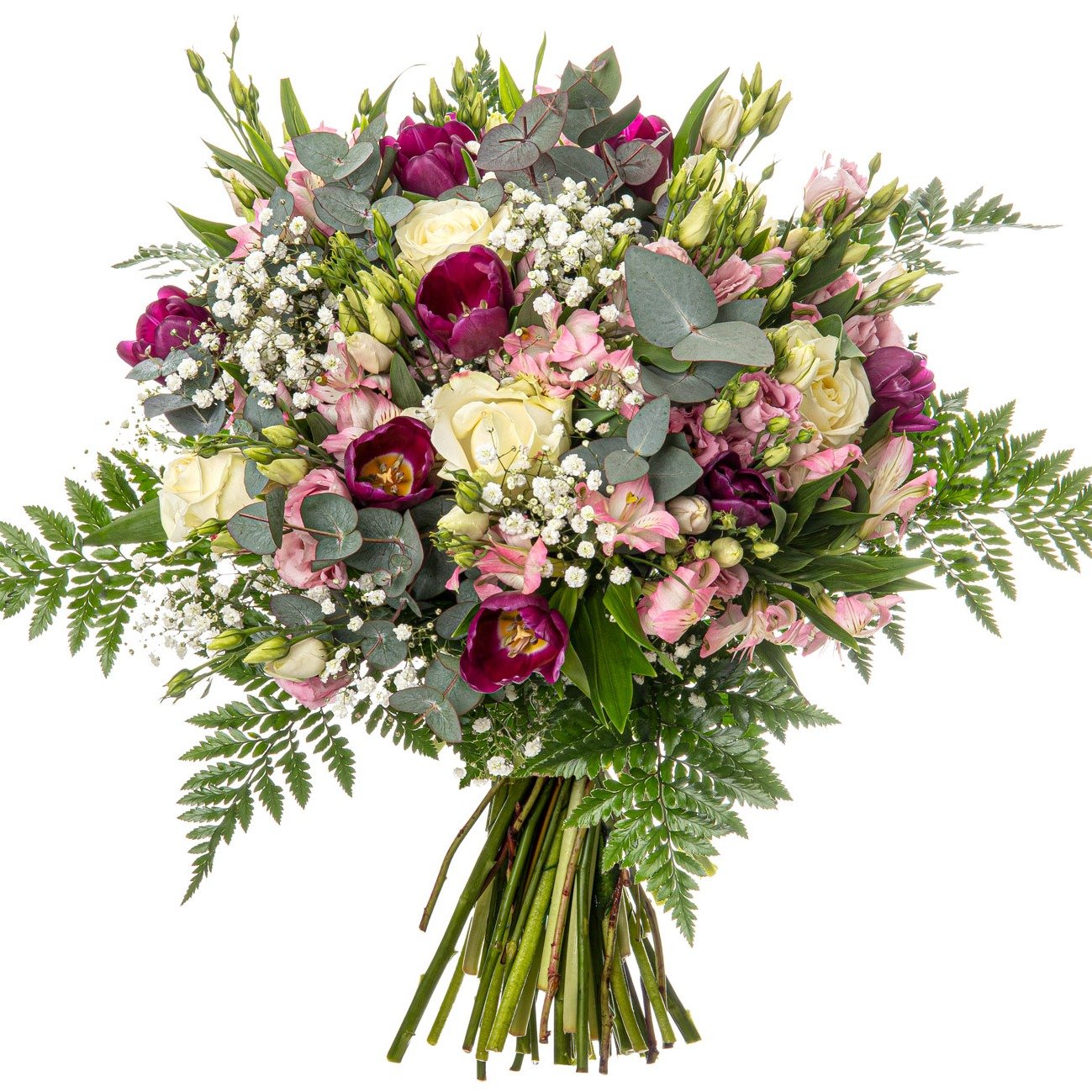 Tato kytice v sobě snoubí jemnost světlých eustom, romantiku růží a hravou eleganci tulipánů. Kontrastní barevná kombinace vínových, růžových a bílých květů je doplněna gypsophilou a svěží zelení, které dohromady působí harmonicky a svěže. Vzniká tak kytice, která rozzáří každé slavnostní setkání, potěší při významné příležitosti i jako pozornost pro každodenní radost. Objednávku doručíme v den objednání během pracovních dnů, zároveň si můžete zvolit přesný čas doručení. Samozřejmostí je potvrzení doručení e-mailem a maximální vstřícnost našich zkušených floristů – rádi vám poradíme také telefonicky.