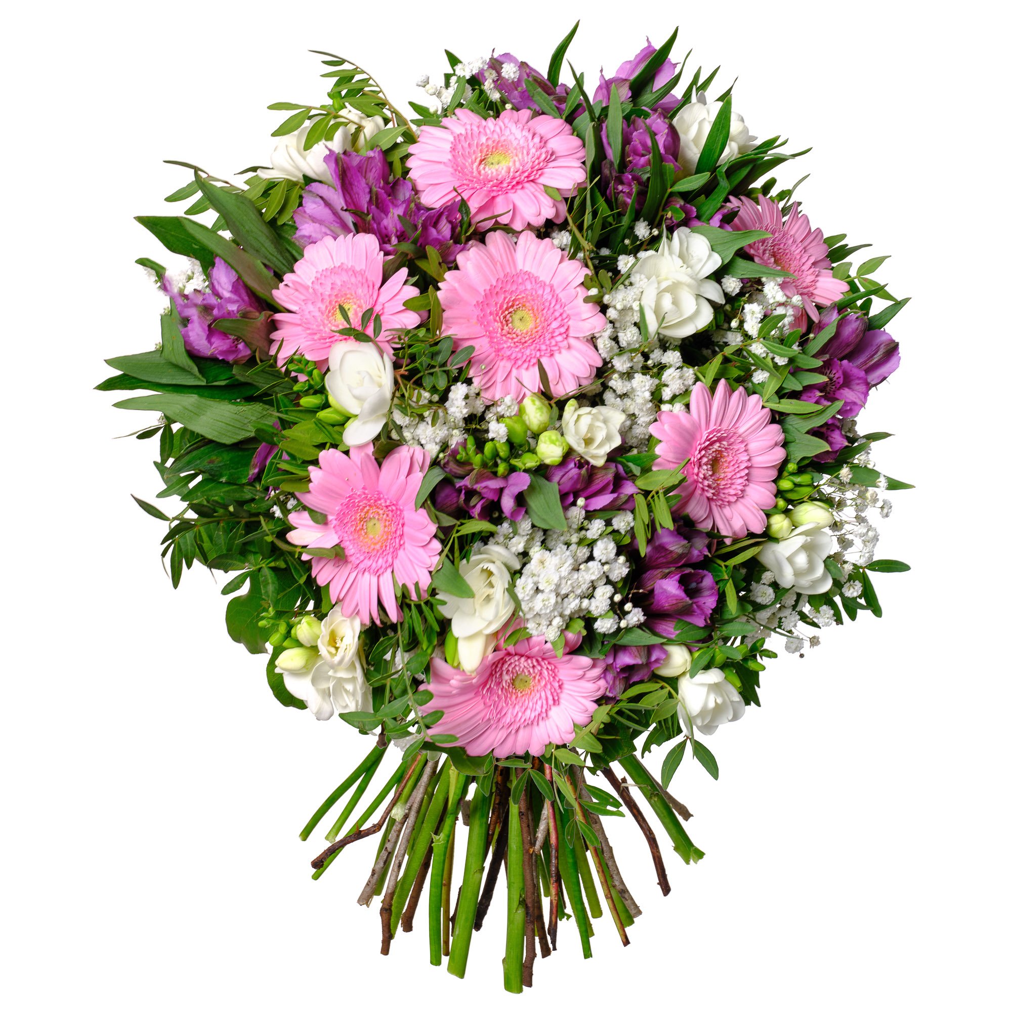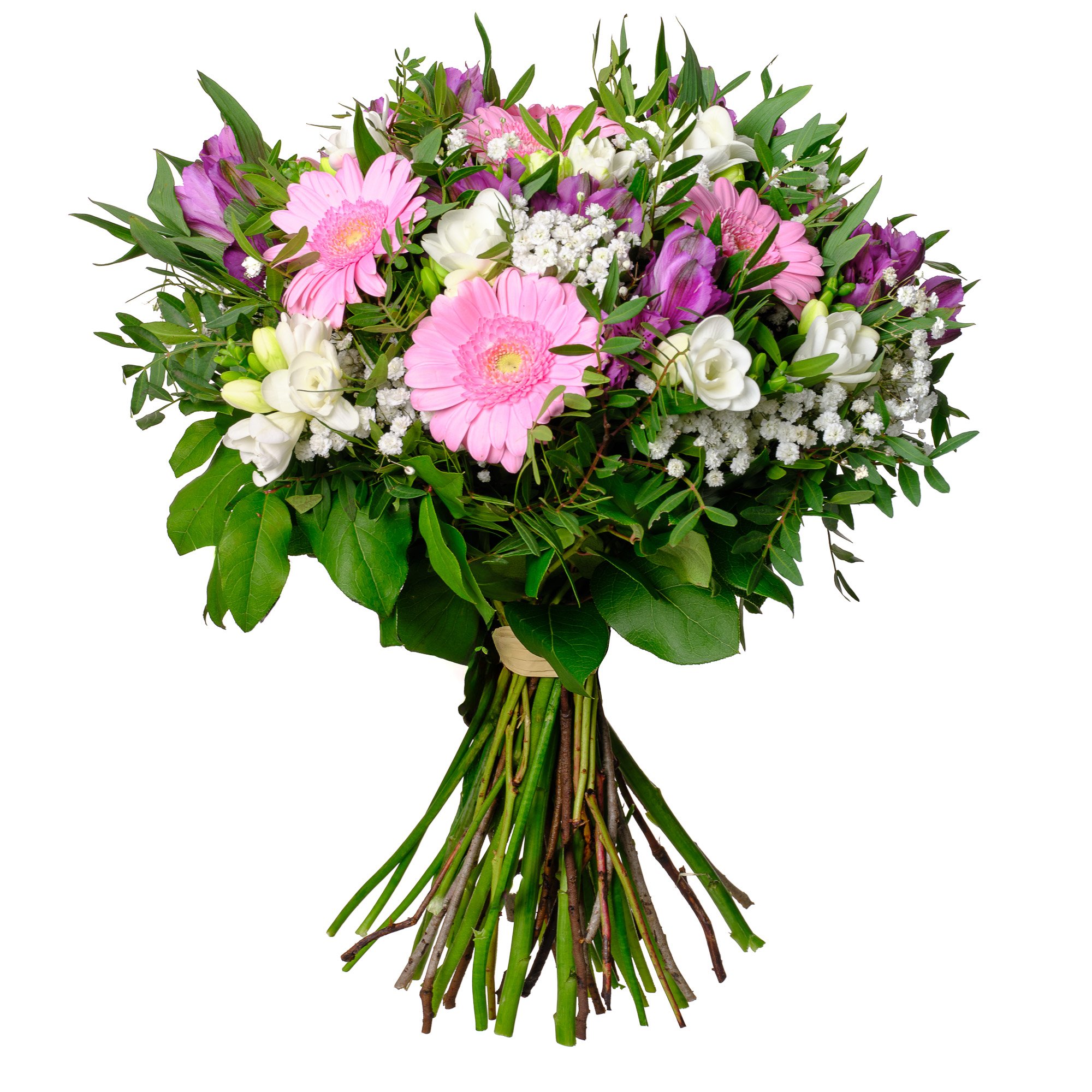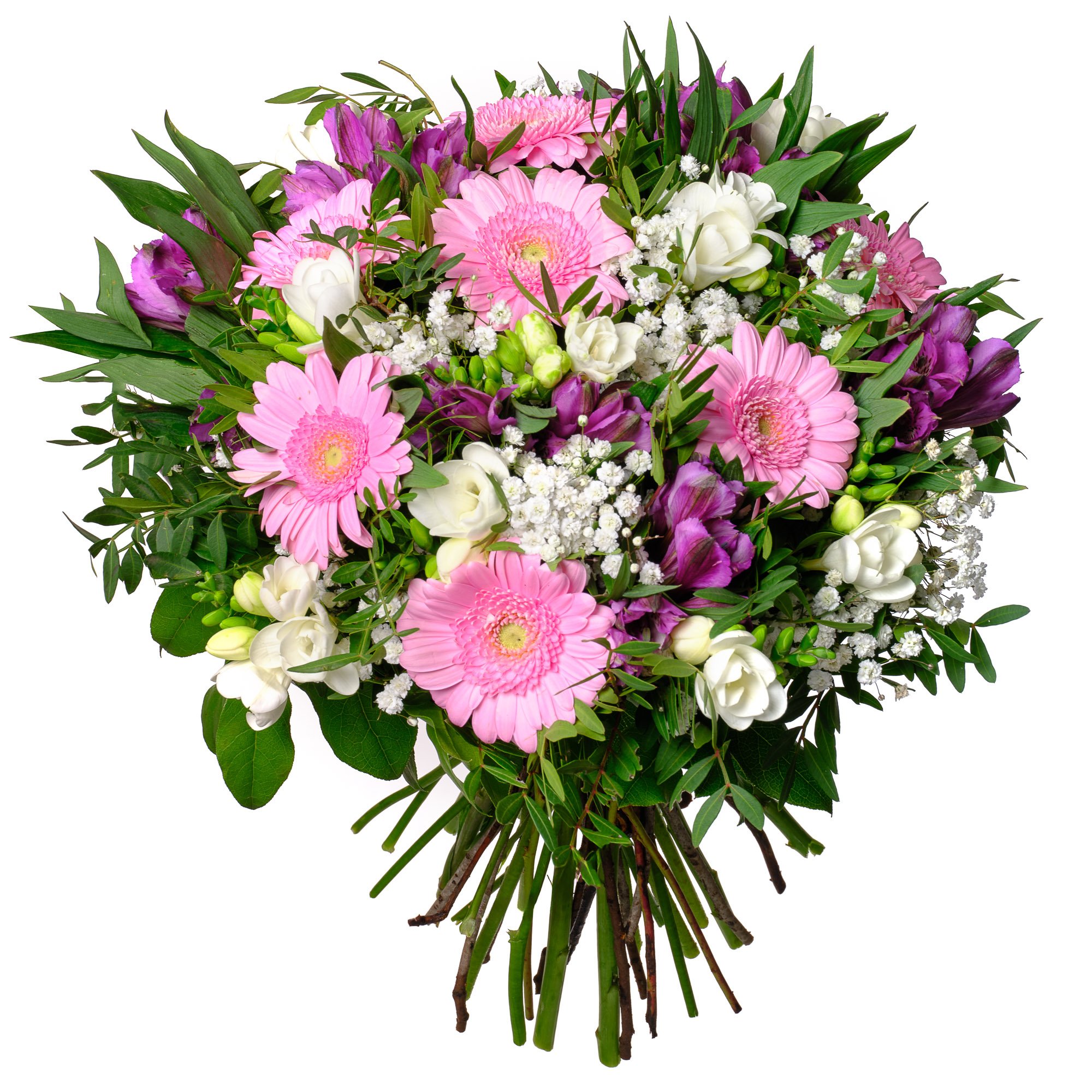 Jemná kombinace svěžích gerber mini, alstromerií a frézií v této elegantní kytici vytváří harmonickou hru barev, která potěší při každé příležitosti. Růžové a fialové tóny působí radostně a lehce, bílé frézie vnášejí do aranžmá čerstvost a jemnost. Celkový dojem podtrhuje decentní zeleň, která kytici dodává vzdušnost. Tento uvázaný pugét se skvěle hodí jako překvapení k narozeninám, výročí i pro potěšení jen tak pro radost. Doručujeme vždy v den objednávky během pracovních dnů a nabízíme také možnost objednání přesného času doručení. Vždy Vám rádi poradíme i po telefonu.