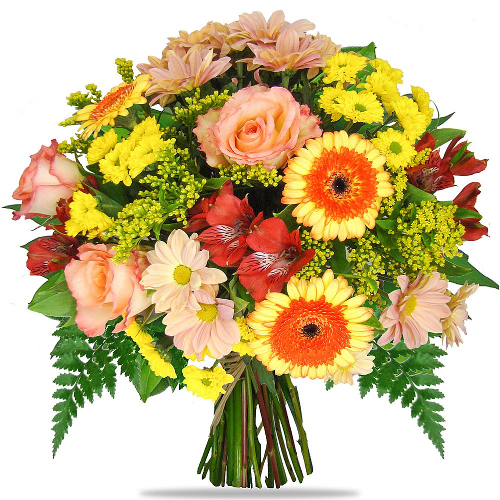 Tato květinová kytice vyniká krásnou kombinací něžných růží, pestrých germín, zářivých chryzantém a jemné alstromérie, které doplňuje svěží sezónní zeleň. Harmonické spojení žlutých, oranžových, růžových a béžových tónů přináší do interiéru příjemnou atmosféru radosti a optimismu. Kytice je vhodná pro oslavy, jako dárek k narozeninám, poděkování, nebo jen tak pro rozjasnění všedního dne. Květy pečlivě vážou naši zkušení floristé, dbáme na profesionální úpravu a nadstandardní péči o květiny. Nabízíme doručení ve stejný den během pracovních dnů, možnost výběru přesného času doručení a samozřejmostí je i potvrzení o doručení e-mailem.